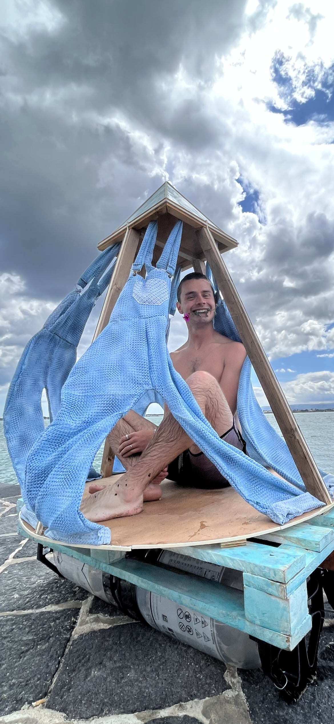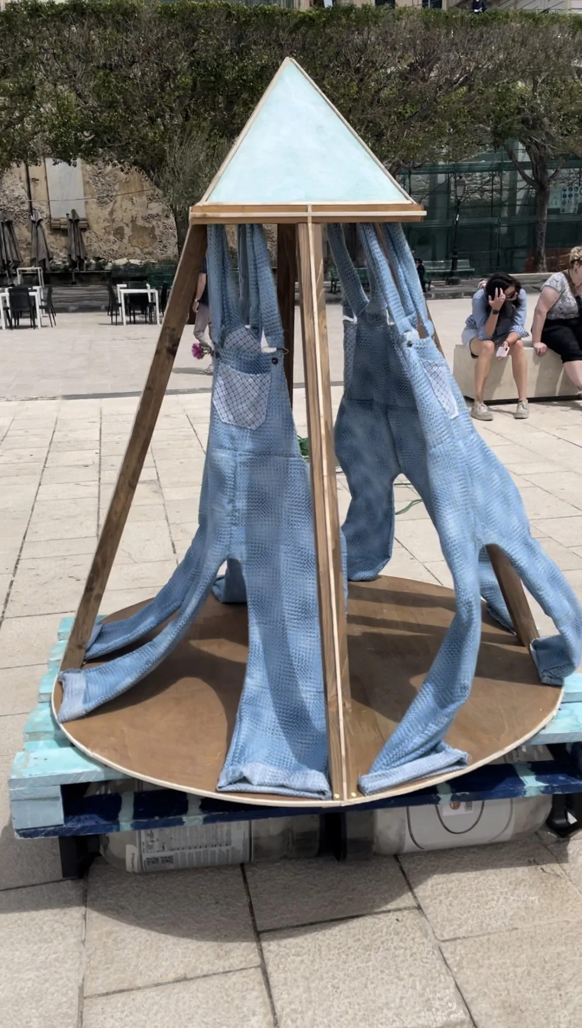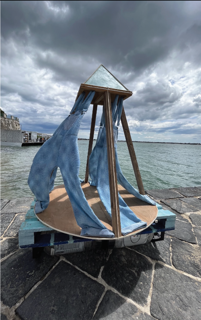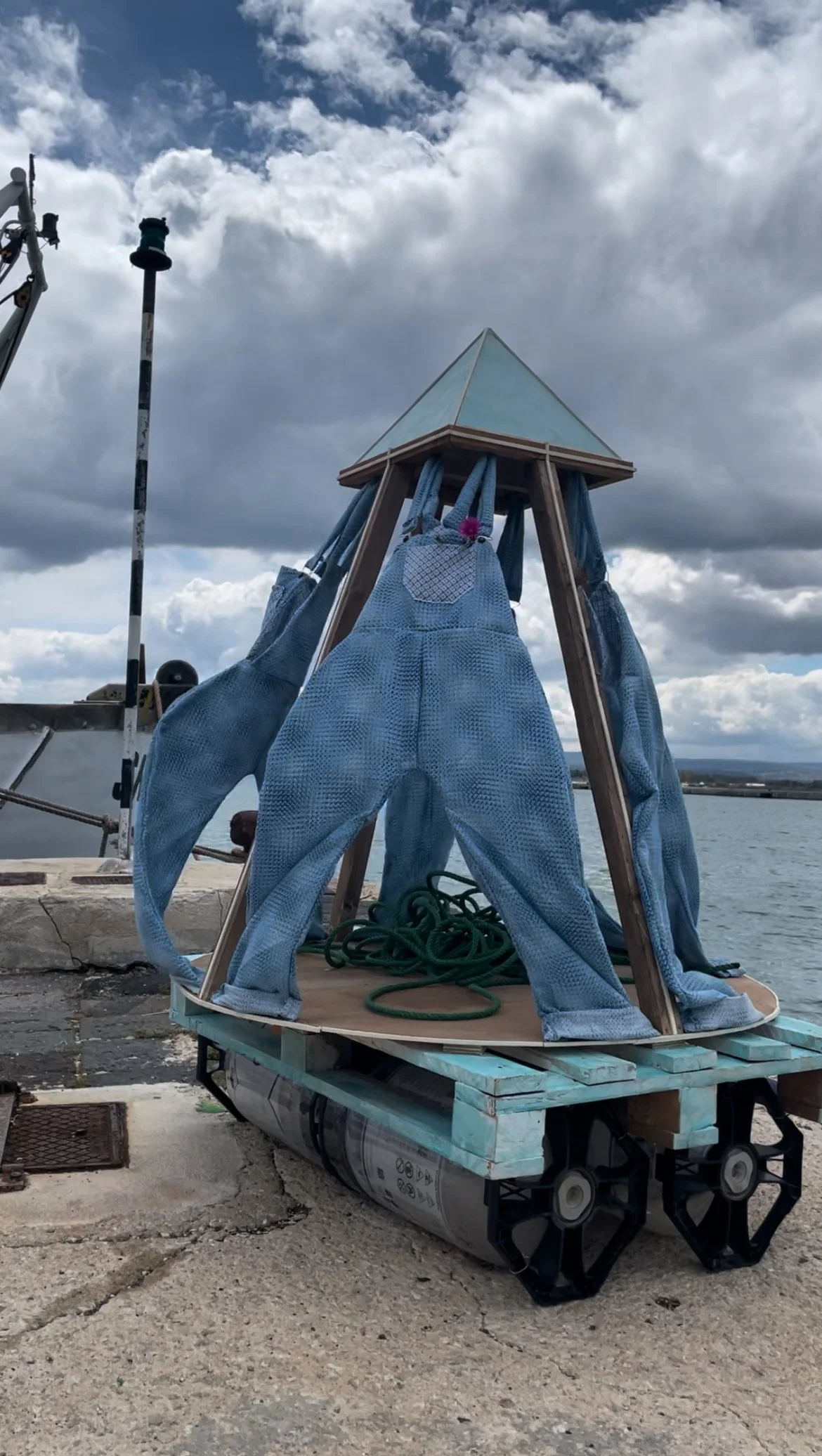 The first step of the process was to attach the floating canisters to a standard size palette. After this, I cut a large circle out of plywood and attached it to the palette. I cut lengths of wood from 2 x 4 planks at the appropriate angle to support the plywood pyramid, then screwed those into the circular board. The overalls were created using a sewing machine. Afterwards, they were attached to the top of the pyramid using eye hooks and to the bottom of the circular board with nails. The method of attachment gave the overalls enough freedom to ebb and flow with the currents of the wind. I stained the structural elements and painted the palette and pyramid a light blue to match the color of the sea