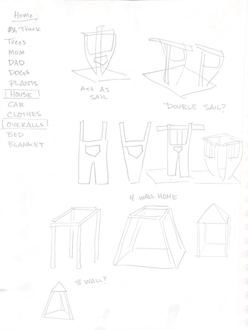 The items and concepts I used to express my longing for home were overalls and my house. Overalls give me a sense of comfort and support that reminds me of home. However, I couldn’t bring them along on the trip, as they took up a remarkable amount of space in my tightly-packed bag. I constructed a strong four pillared structure as a symbol of home and attached overalls sewed from a lightweight fabric to their frame to act as sails for the vessel.