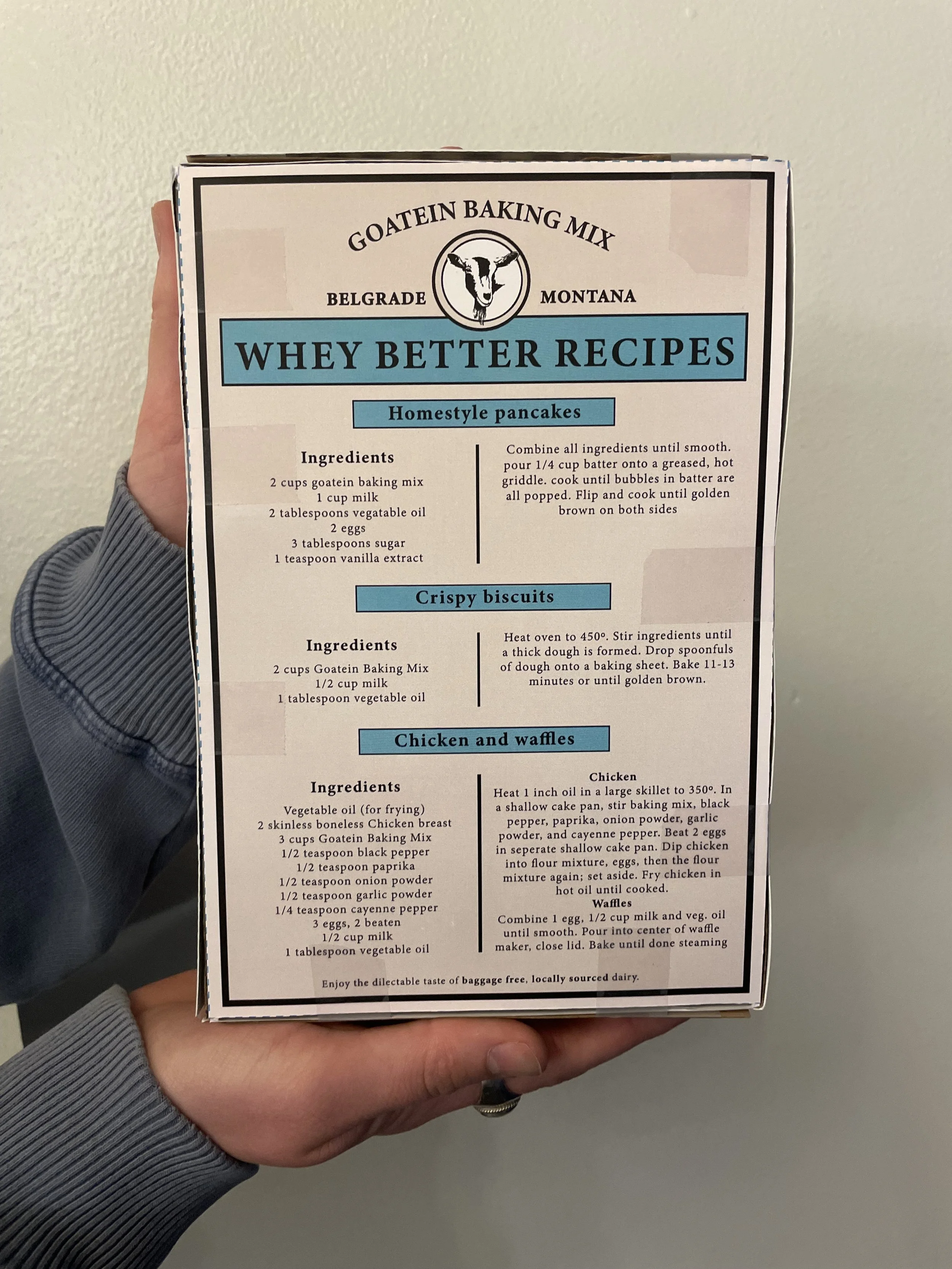 The design features a bold logo and catchy phrasing, creating a strong billboard that draws attention from afar. It strikes a balance between appearing safe, friendly, and honest—qualities essential for opening consumers up to the idea of goat dairy as an approachable, alternative option. The color palette is striking and well-contrasted, effectively communicating the product’s qualities while ensuring it stands out on a shelf without clashing with the norms of baking mix packaging.