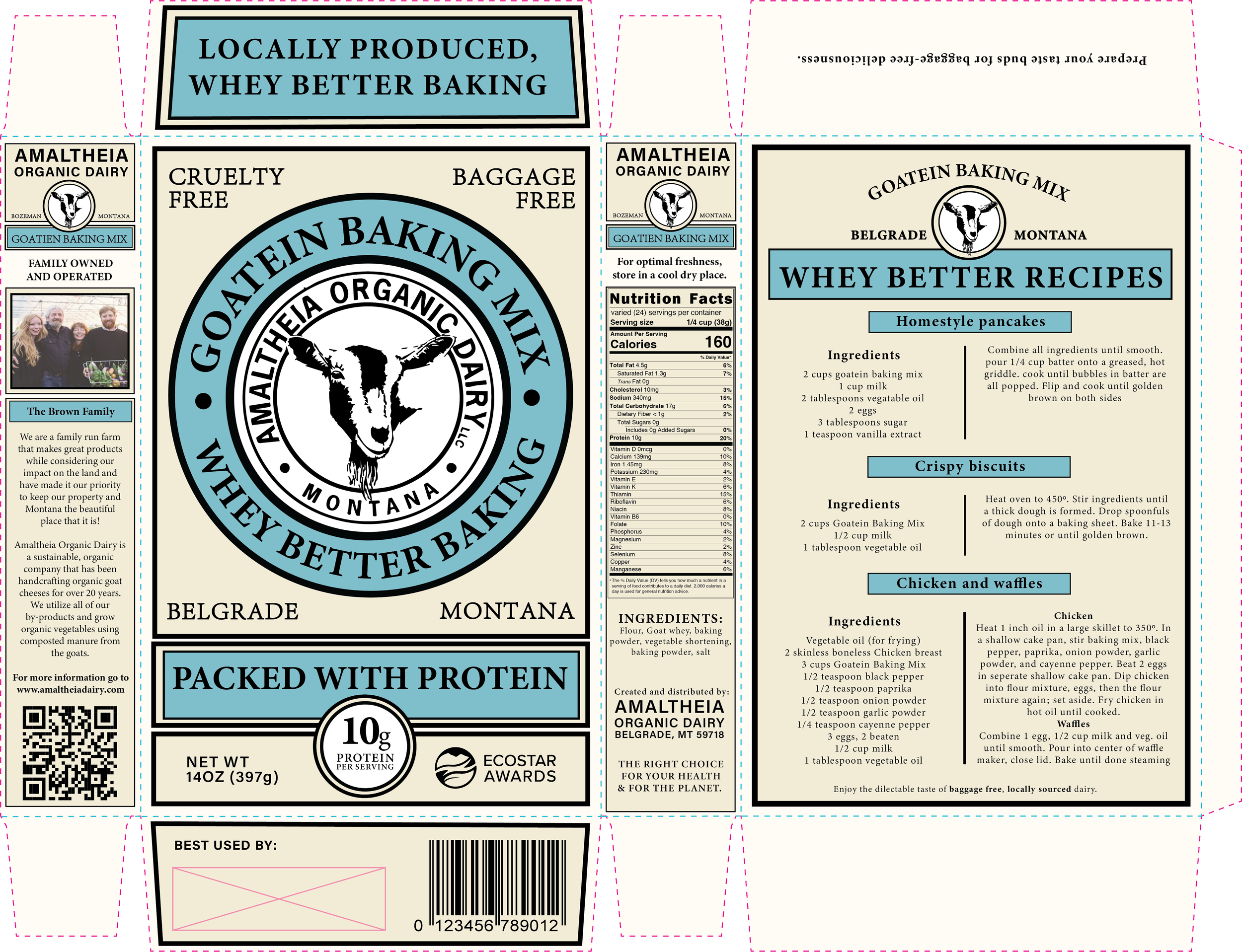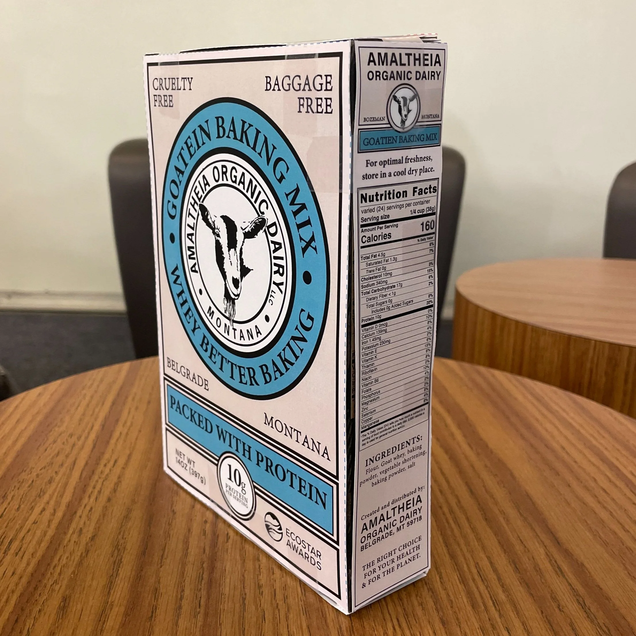 Upon receiving a great deal of praise for the product, it was time for me, as the sole designer of our group, to execute the packaging for Goatein Baking Mix. The goal was to create a design that aligned with the pre-established visual language of high-end baking mixes, such as Kodiak Cakes and Snoqualmie Falls, while seamlessly extending the strong branding already present in Amaltheia’s products.