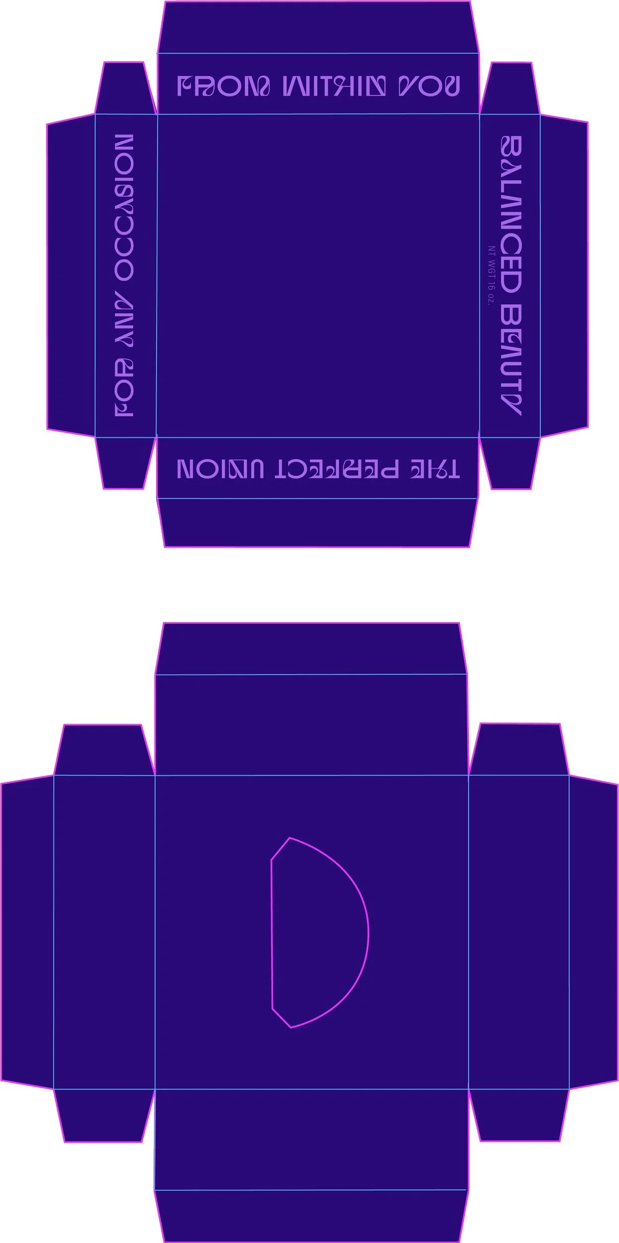 For the box design, I opted for a “box within a box” concept to hold the perfume, creating a platform that the cover could seamlessly slide over. Precision in measurements was crucial to achieve two goals: a) ensuring a smooth, seamless opening experience, and b) allowing the box top to rest perfectly atop the bottle, providing a solid, stable, and secure feel to the packaging. As the main themes of this brand are confidence, balance, and comfortability, it was of the utmost importance to consider those elements in the unboxing and handling experience.
