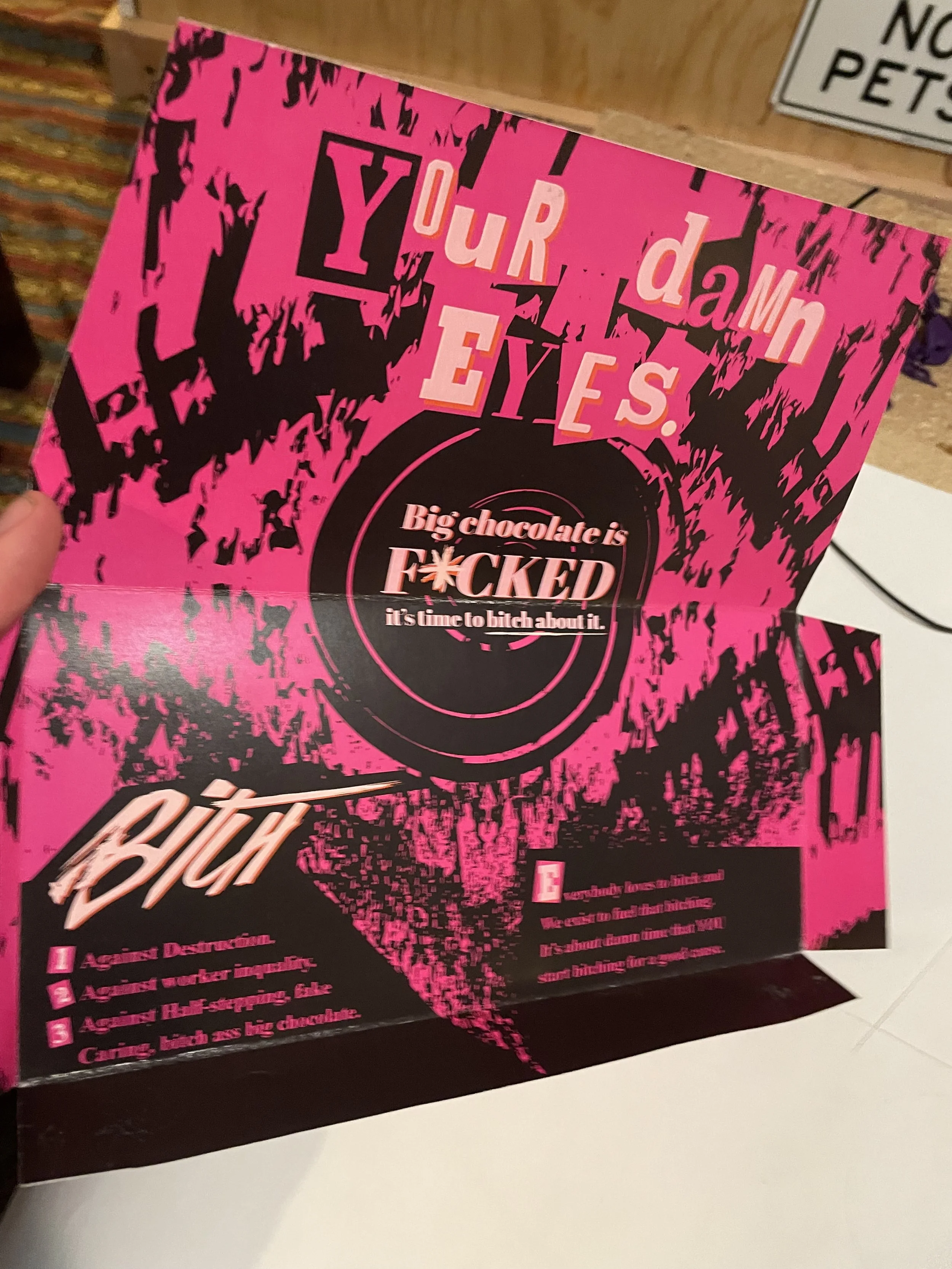 "Bitchin! Chocolate" earns its name in two ways: it’s cool, rebellious, and speaks directly to a Gen Z audience, but it’s also literally “bitchin” for a cause—calling out the injustices of the chocolate trade and demanding change.
