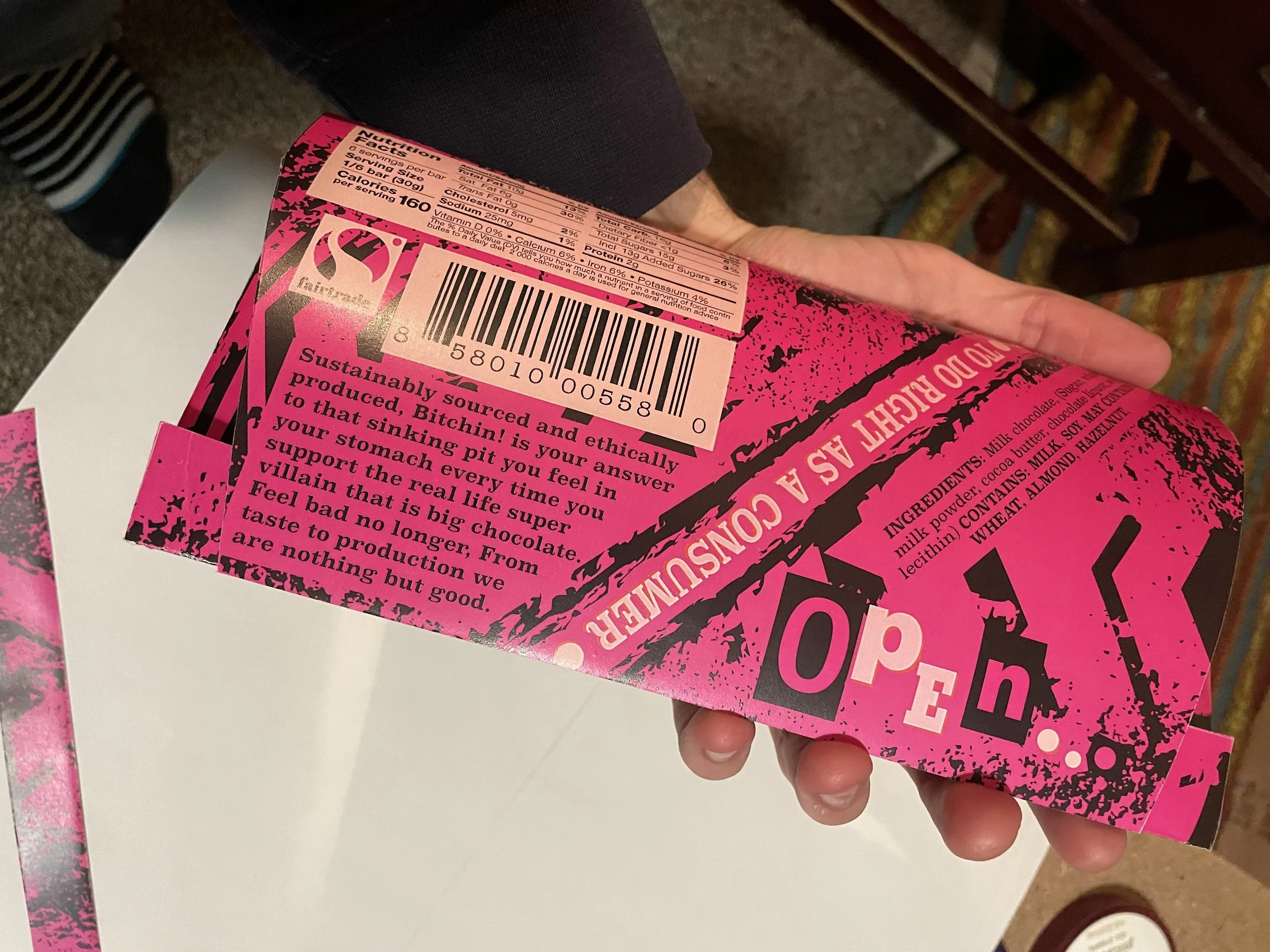 I put a lot of thought into the viewing experience of the package. The bold design grabs attention, making someone pick it up—but the real message unfolds as they interact with it. The phrase "open..." on the back connects directly to the inside, completing the statement: "open... your damn eyes." Once opened, the package delivers a deeper explanation of exactly what it’s “bitchin” about—the harsh realities of the chocolate industry.