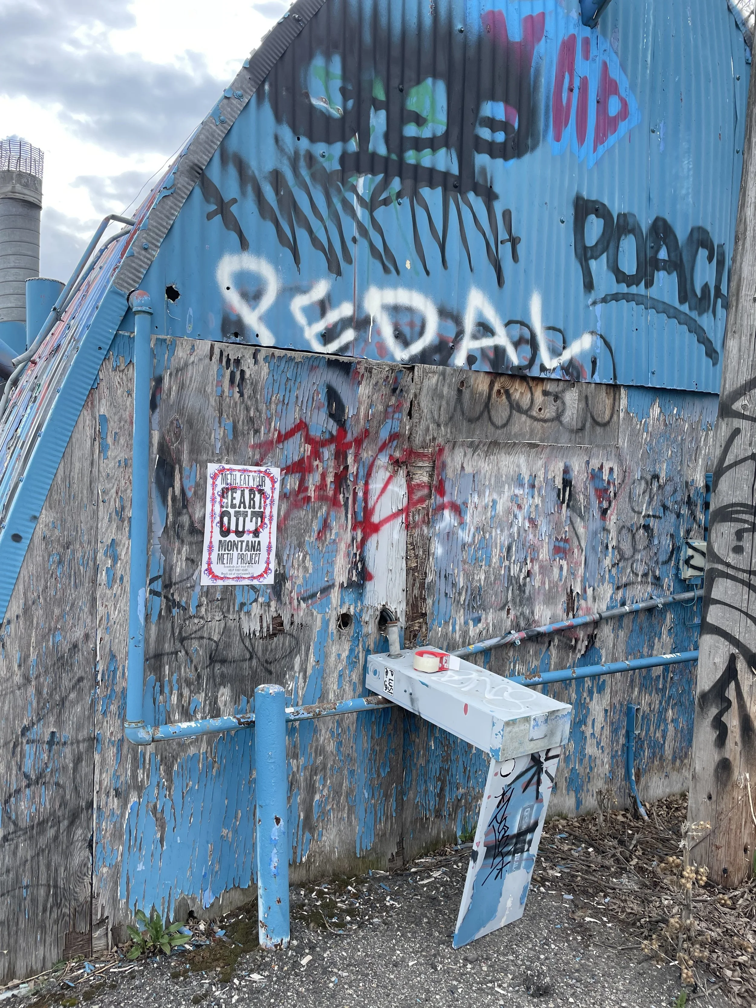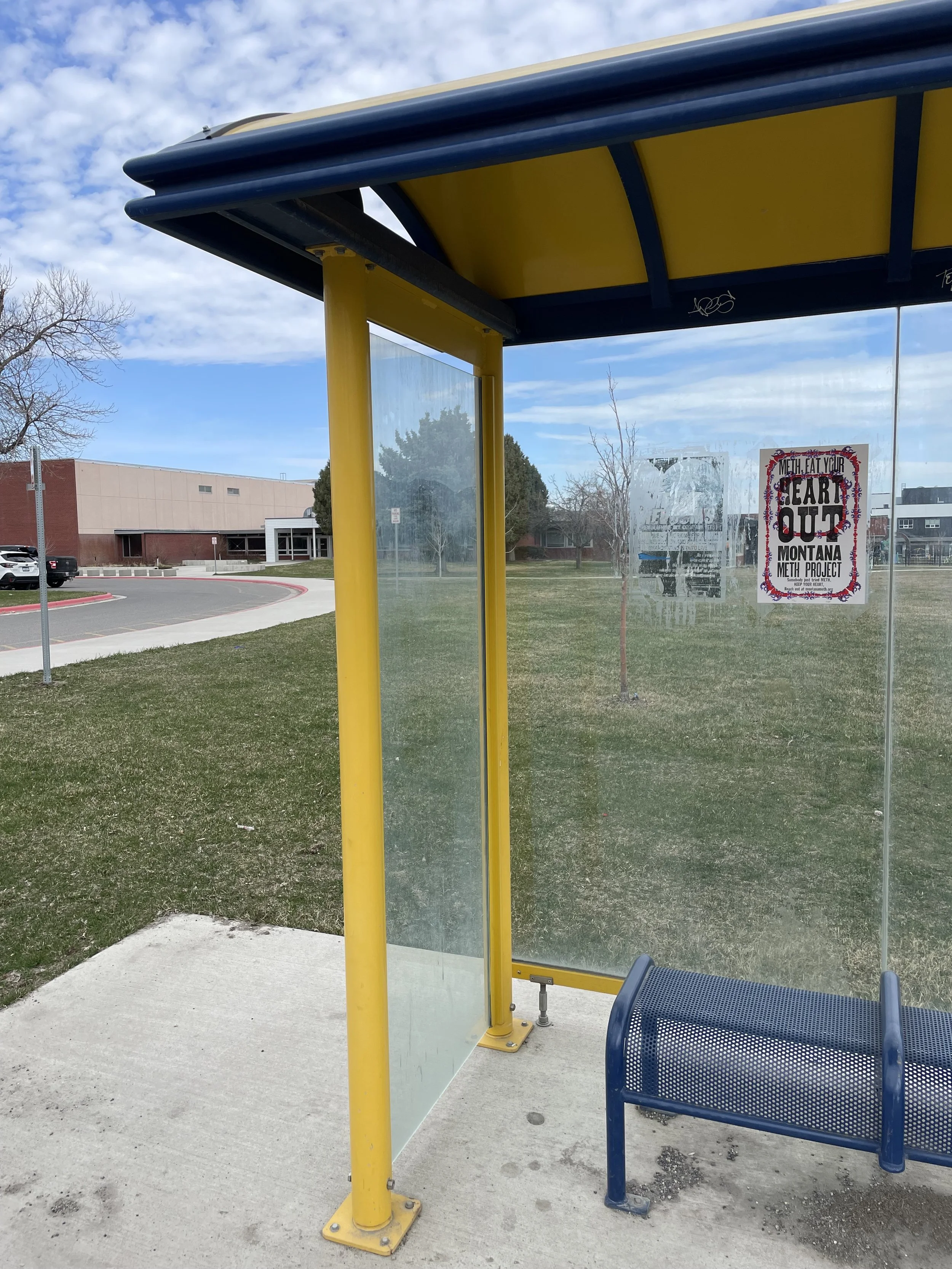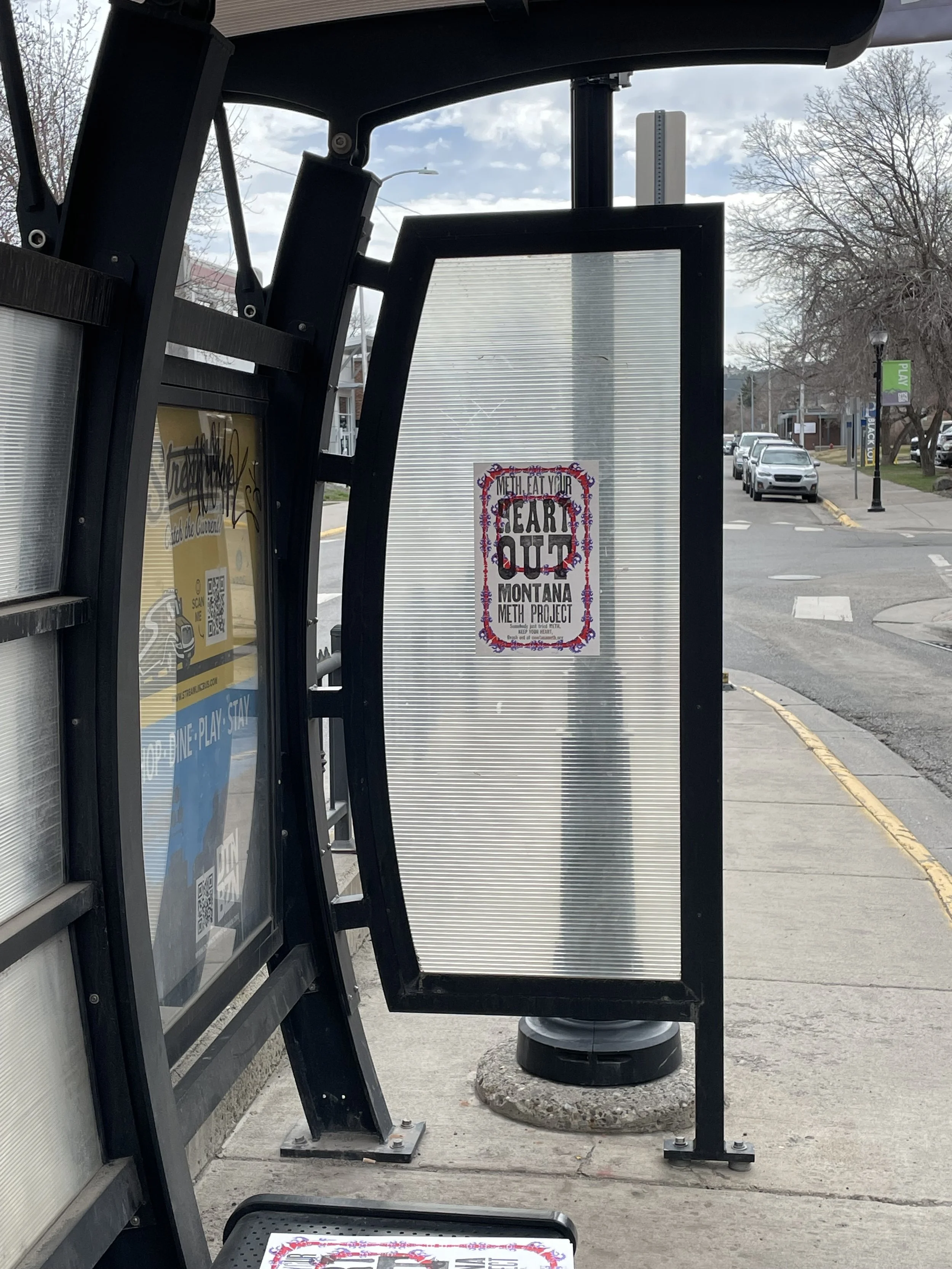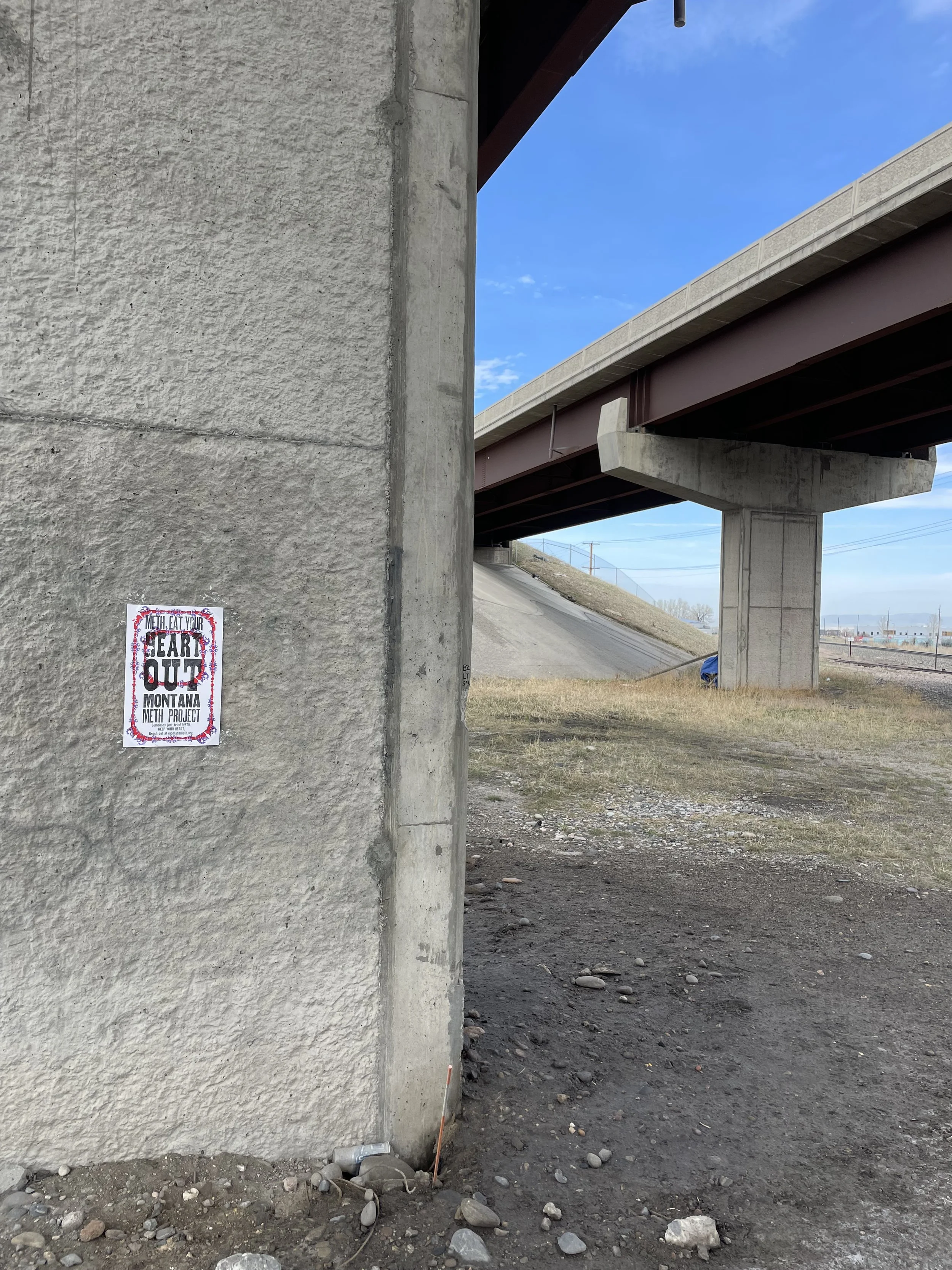 For the final step in this project, I was tasked with distributing my poster editions throughout the Bozeman community. I aimed to be intentional about where I placed these posters, selecting locations that would maximize their relevance and impact. I chose bus stops, under bridges, skate-parks, graffiti walls and parking garages—areas often frequented by the homeless community, a group particularly vulnerable to the harmful effects of meth.