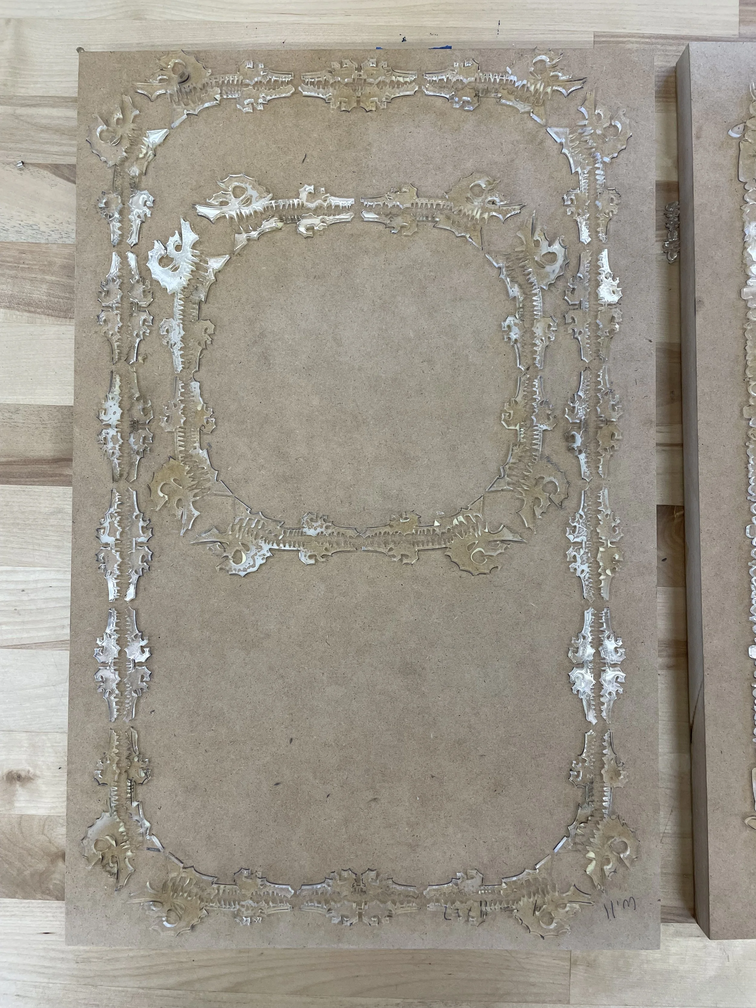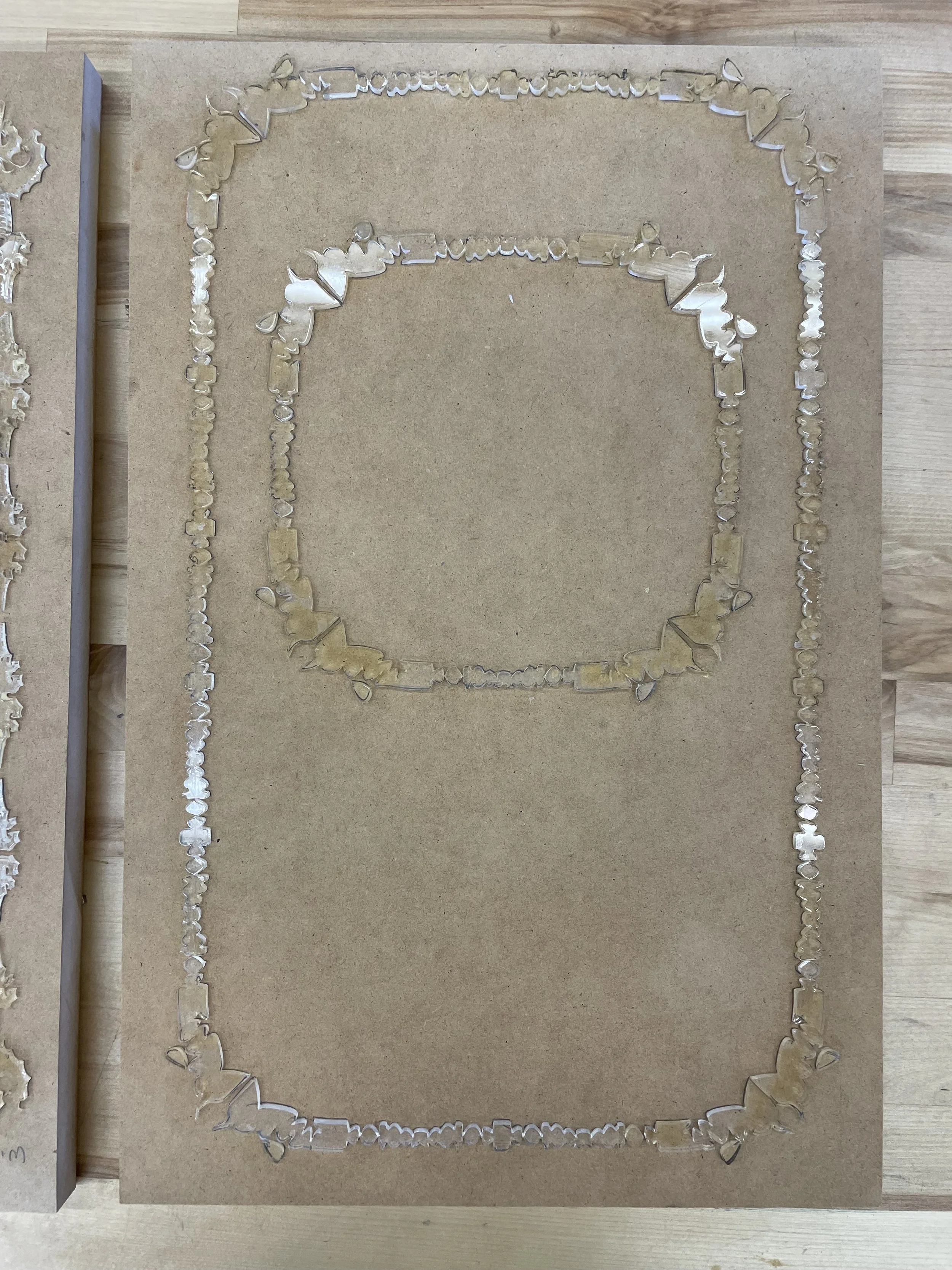 The choice of deep lavender and red creates a high-contrast color palette, enhancing the visual impact and ensuring the overlay is distinctly visible. After finalizing the design, I split the file into two layers and proceeded with laser cutting the forms out of plexiglass, which will be used for the final printing process.