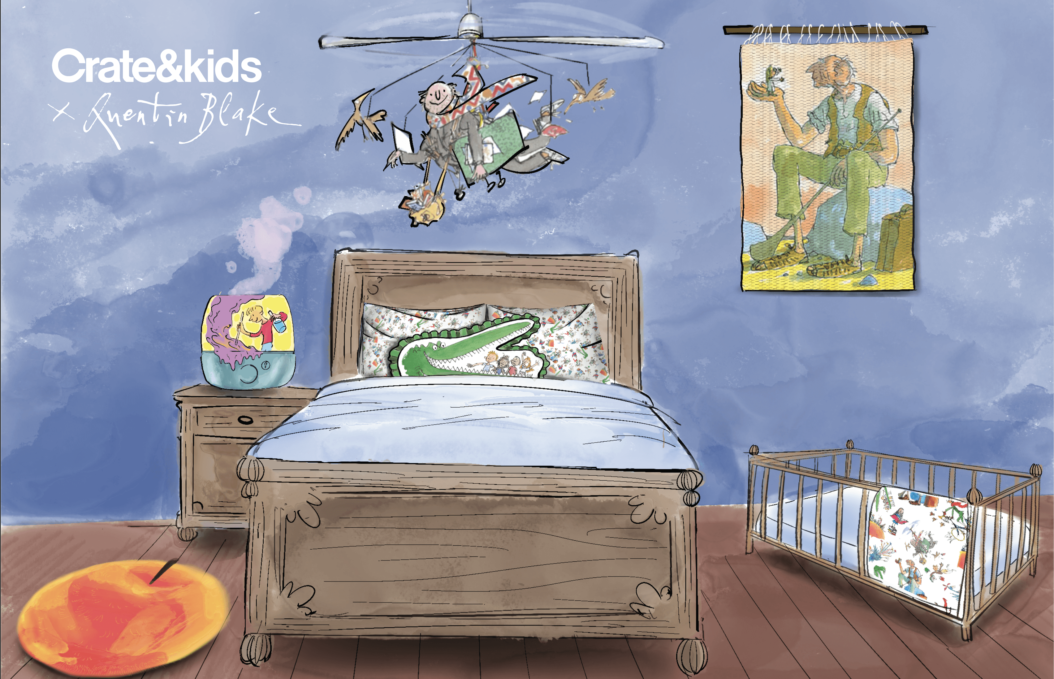 The bedroom set draws on Quentin Blake's illustrative style and bold color palette to transform ordinary objects into storytelling pieces. Timeless mementos that connect parent and child through shared feelings of safety, love, and comfort.